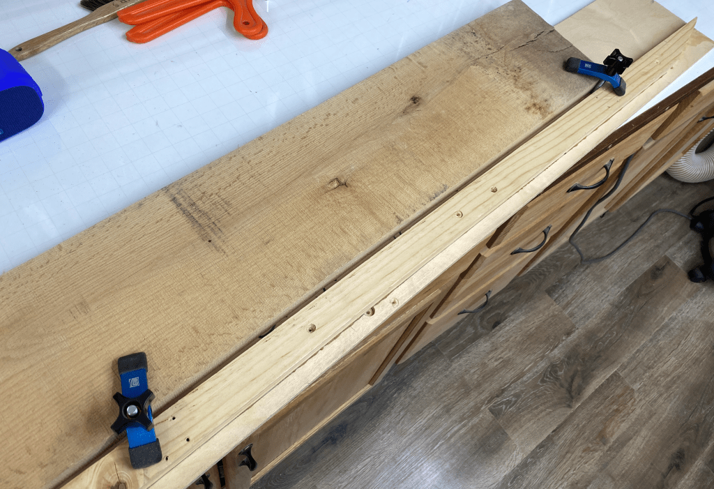 None of the edges were straight. Our next step then was to set up each board on a straight edge jig, clamped down on the jig so that each piece could be run through the table saw for a 90 degree rip cut. Our jig is a ½ inch thick piece of plywood, squared up on the fence where simple overhead clamps hold it on the jig for a single straight pass. Once you cut a clean straight edge on one side of the board, you simply need to run that flat side on the table saw fence for the rest of your rip cuts. Using a good 60 tooth trim blade on our table saw also meant that the edges were pretty smooth and could be used as is for the rough length cuts. There was no need to run the boards through a jointer which is good, because I don’t have one. I’ve had great luck on glue ups against those 60 tooth blade cuts without a joint failure. (See the straight edge jig picture below)