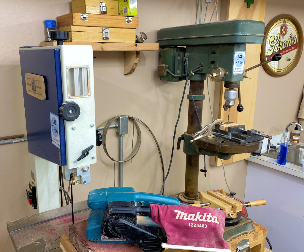After making initial cuts on the table saw and unclamping whatever I might have glued up, many of the projects I take on require some initial rough shaping and sanding. Not so much on fine furniture, but when I’m doing an art project or a kinetic sculpture that requires me to put curves into wooden pieces, I’m either at the stationary wide belt sander and grinding wheel or using my hand held belt sander on something clamped up in my vise. When making a paddle to accompany the Cedar canoe we built during COVID, the hand held sander with a 40 grit belt did a great job removing material and thinning down the blade of the paddle. It was faster than using a hand plane and the right tool for the job. Shaping on smaller pieces is easier when holding them against the stationary belt sander, though you have to be careful. I’ve lost skin in an instant by getting too close to the belt. Band-Aids are definitely required, for me at least.