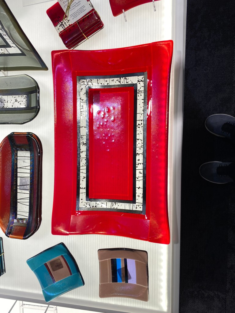 During my stroll through the shop I stumbled upon a featured glass artist who used colorful but simple combinations of glass to form a series of flatter platters and trays. The Verre Visage Studio was headed by Christine Freeburn and some of her glass platter designs were pretty amazing. One of her larger pieces featured a red perimeter and some welded white and black accents and the light bulb went off in my head. Not that I can duplicate her naturally flowing and exact tray design with wood, but I could use the color theme and substitute wood varieties to make a similar sized tray. I’ll place her studio link at the bottom of this blog.
