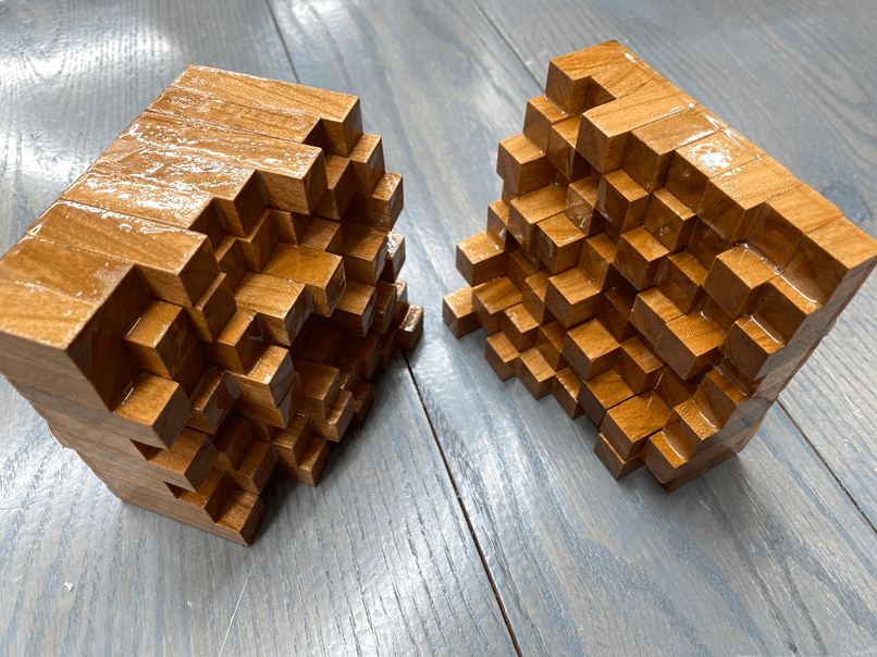 Pieces. Lots of pieces. Different lengths and perfectly matching widths and depths. In the end my design would have them all nestled together in a cube with the individual blocks standing upright at different heights. “Cool”, I thought. “Lots of clustered and yet somehow disorganized pieces.”