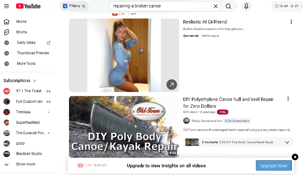 Last tidbit. I had published a video a couple years ago about repairing and finishing a broken cedar canoe. On a recent search, it doesn’t even show up in the top 30 video listings on YouTube, though it got way more views than others in the list (with a better thumbnail and better video quality). Wanna know what pops up on the top of the search list? See below.