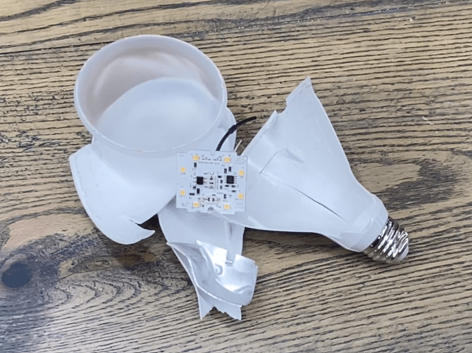 LED light sources were the next problem because none of the commercially available socket and bulb solutions would fit inside my lamp head design. I needed something small and bright but also flat. So I took a small LED spotlight like the ones you screw into a ceiling socket and hit it with a hammer. Don’t do this at home. I’m a professional and I know what I’m doing. 😉 😮