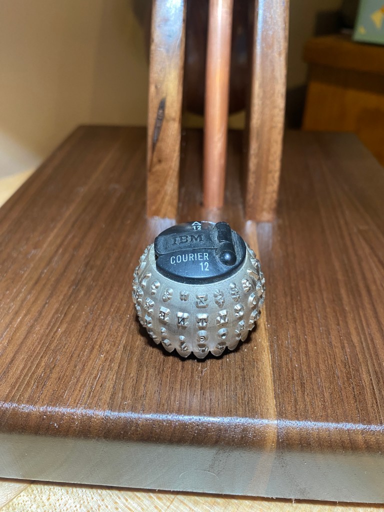 Remember those old IBM Selectric typewriters? I guess you might have to be older than 50 to have ever seen or used one, but they were the business standard before computers were a common thing. As my old company was tossing a bunch of these typewriters away one day, I rescued a few of those aluminum type ball heads from the machines. With the locking nuts glued into those typing ball heads, they made for a pretty cool retro solution to lock up the lamp angle. Oh, and one more typewriter ball to cover a rotating switch on the front of the lamp base too. It looks pretty awesome.