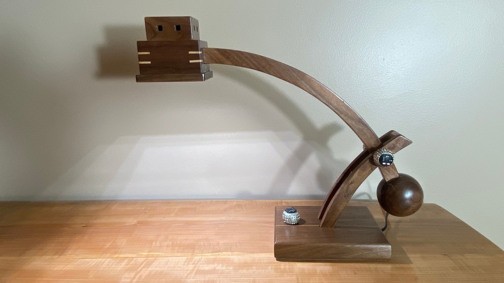 Style wise, I was looking to stick with the mission / craftsman furniture period from the early 1900’s. I chose this period because it fits with other furniture pieces I’ve made but it would also compliment a Frank Lloyd Wright inspired office clock I designed a couple months before. I wanted the lamp arms to be articulating so that you could adjust the light lower to the desktop, or higher up to wash over a larger area. I also wanted to avoid straight cut wooden pieces because I thought a curved lamp frame would look a little more complex and bespoke. A three layered square birthday cake design was drawn up on paper for the lamp head, looking a bit like an art deco pyramid, and I thought I might need a counter weight for the short end of the lamp’s boom arm. “Wouldn’t it look cool”, I thought to myself, “if the counter weight was a perfect wooden ball?” Oh, and I should probably use some sort of low profile LED light system inside the lamp head so that the head wouldn’t have to be too massive, supporting a traditional socket and light bulb setup. Yes, yes, yes. A brilliant sounding set of design criteria. Where’s the tequila?
