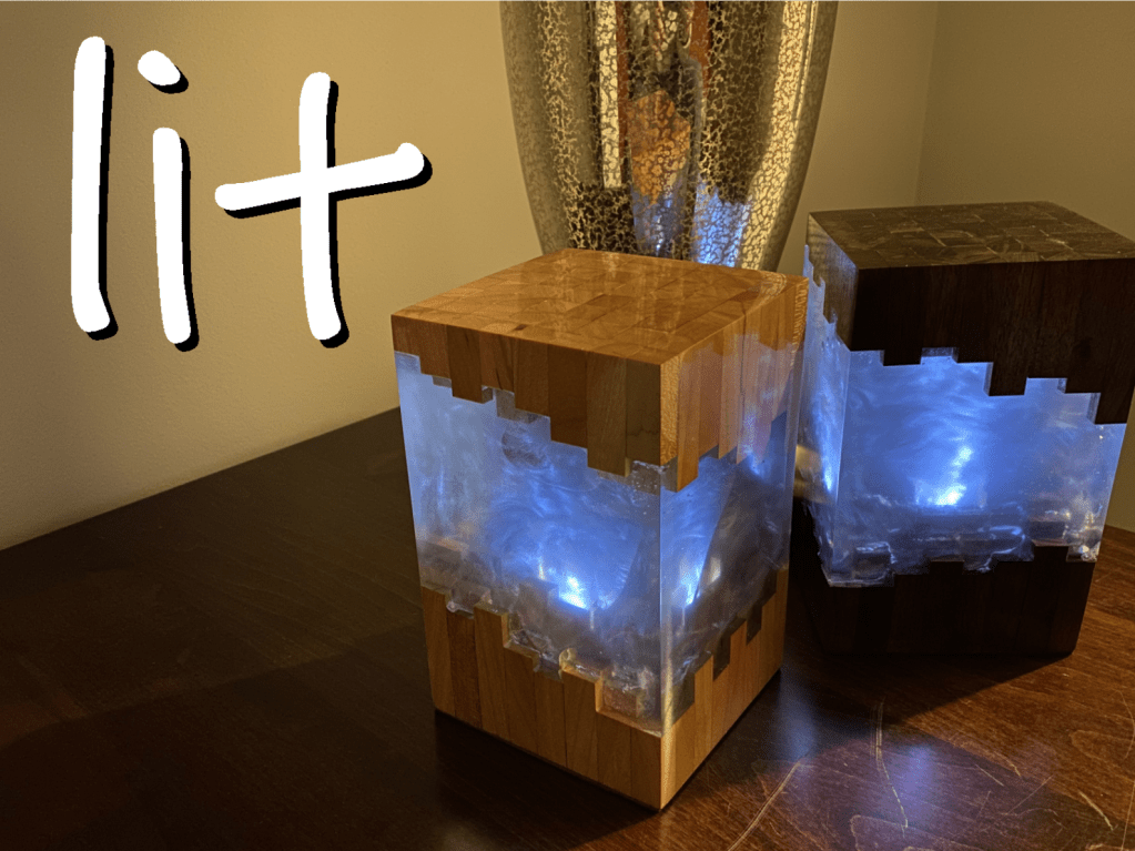 The Tesseract looks a little more geometrically interesting with some Cherry and Walnut block accents, an embedded LED light and clear epoxy framing the whole block… A very cool table accent light.